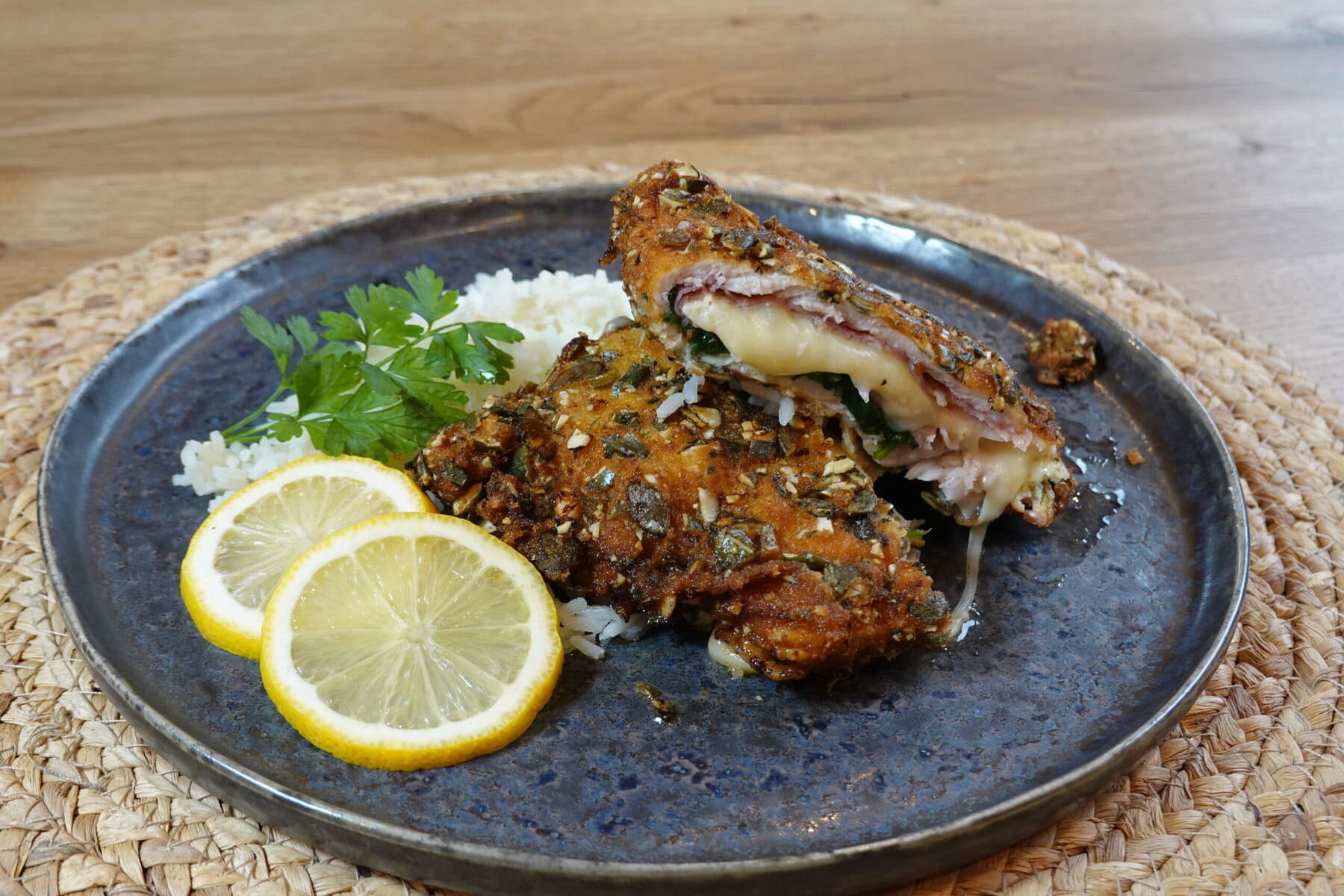 クリスピーでジューシーな、典型的なシュタイヤーマークである。 シュタイアーシュニッツェル はコルドン・ブルーのバリエーションだ。ハムの代わりに香ばしいチーズとほうれん草を詰め、かぼちゃの種のパン粉で焼き、クリームをトッピングして食べる、 バターガーリックライス を提供した。シュニッツェル・ファンにはたまらない!